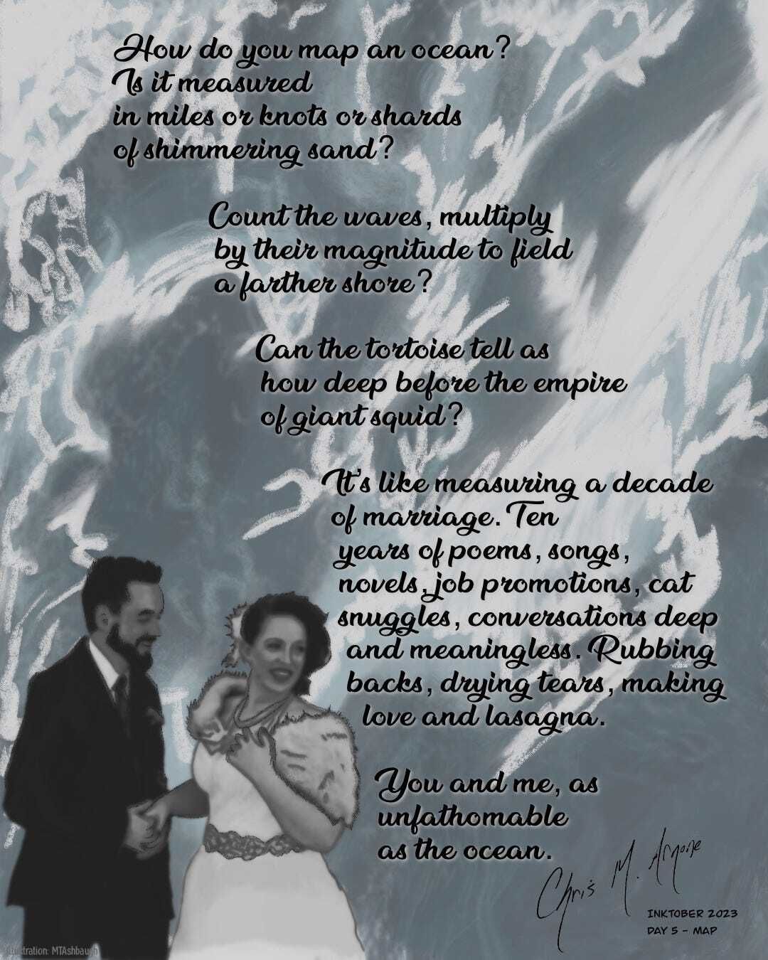 More beach poetry. This was the first poem of Inktober that made me sit there and really think about how to respond to the prompt. Map? Makes sense for ink drawings, but less so for poetry. Gazing out over the ocean, though, I found it. And wound up writing a love poem for my wife. This vacation was for our 10-year anniversary, after all, so it was fitting. This was also the first poem of the challenge that I think has legs, that I’ll keep working on.