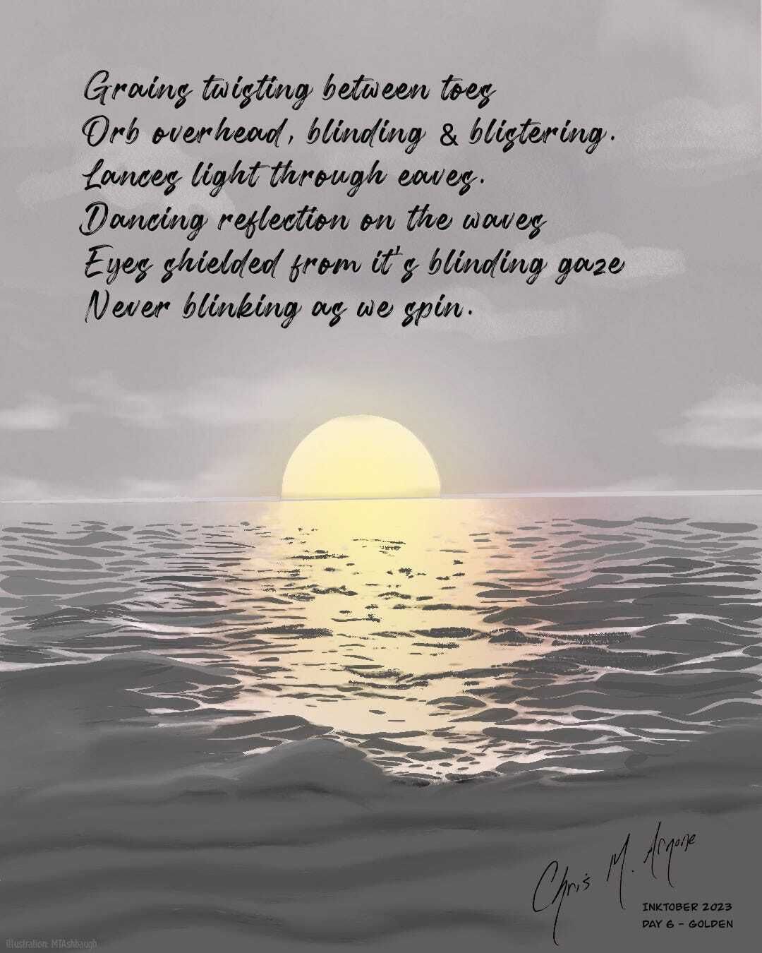 Sunset over the ocean. Yeah, that’s about right. And again, I didn’t send Matt a photo, so he created this from the poem and his own memories. I love that juxtaposition.