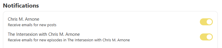 While I truly hope that you stick around for The Intersexion, Substack will allow you to unsubscribe from that newsletter while staying subscribed to this one. No promises that I won’t occasionally talk about intersex issues in this space, too, but I want to make sure you know that you have options.